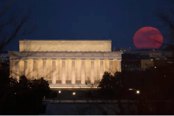 The perigee moon is seen in this photograph from NASA as it rises near the Lincoln Memorial in Washington, D.C. The last time, previous to this, a full moon was seen this close to Earth was in March 1993.