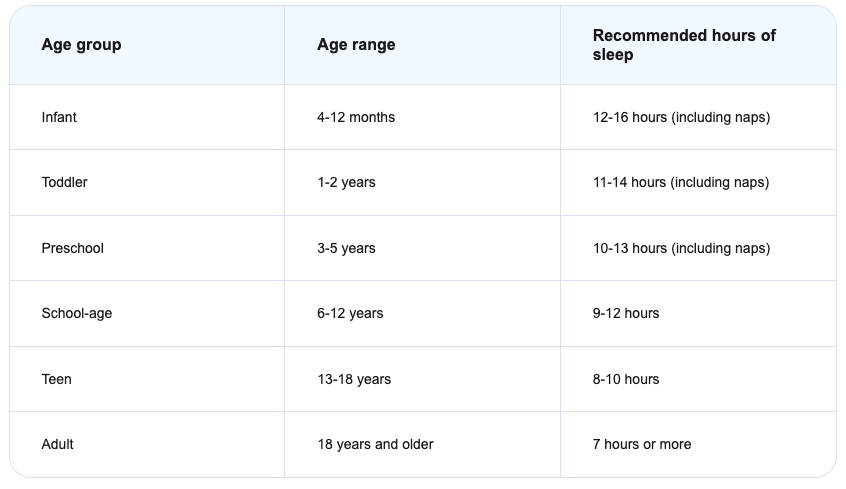 As a basic rule, healthy adults need at least seven hours of sleep per night Trusted SourceAmerican Academy of Sleep Medicine (AASM)AASM sets standards and promotes excellence in sleep medicine health care, education, and research.View Source . Babies, young children, and teens need even more sleep to enable their growth and development Trusted SourceJournal of Clinical Sleep Medicine (JCSM)JCSM is the official, peer-reviewed journal of the American Academy of Sleep Medicine.View Source .