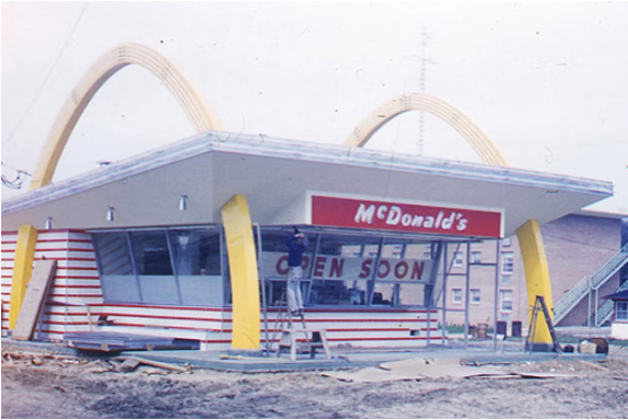 - 1955 – The First McDonald’s Opens – Kroc opens his first McDonald’s in Des Plaines, Illinois, on April 15. The attention-getting red and white tiled building with the Golden Arches was designed by architect Stanley Meston in 1953. First day sales are $366.12.